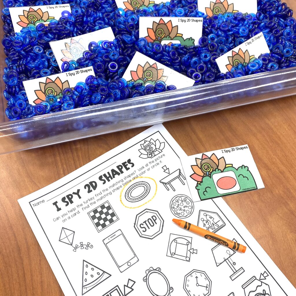 Math gets a sensory twist with our I Spy Shape Game! Students reach into a sensory bin filled with shape cards, pull one out, and color the matching shape on their recording sheet. It’s a fun way to review 2D and 3D shapes while building fine motor skills and attention to detail.